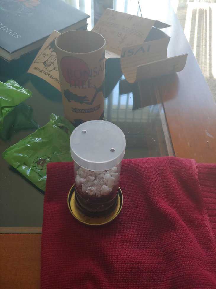This may seem bizarre, but I have long considered myself a failure at keeping plants alive…because I killed one once. So, I figured it was time to try again. I spotted a bonsai tree grow kit on a clearance shelf at Marshalls and thought it was perfect.